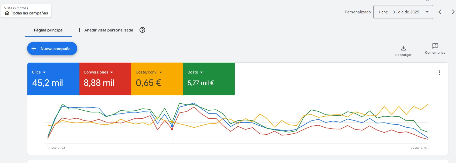 Con varias campañas de Google Ads se consiguieron en 2025 enviar 8.880 solicitudes de presupuesto con un coste de conversión de 0,65€. Todas las campañas fueron enfocadas en 4 provincias de España.